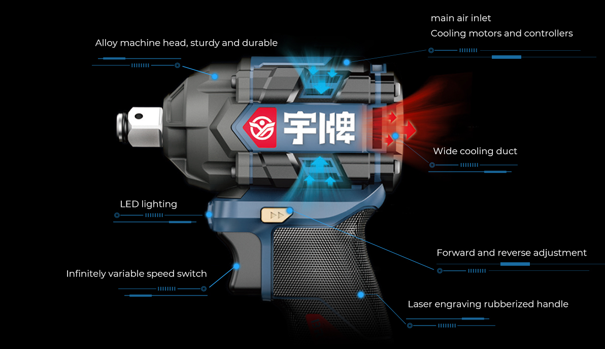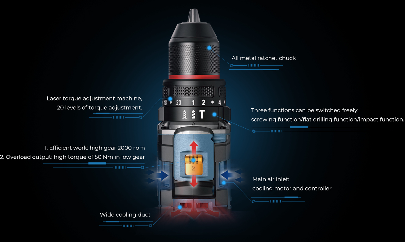 Motorul de mare viteză fără perii generează mai puțină căldură și este mai potrivit pentru utilizare continuă pe termen lung. Puterea este crescută cu 20% și cuplul este crescut cu 30% sub același volum. Are pierderi reduse, disipare bună a căldurii și nu este ușor de demagnetizat. În aceleași condiții de lucru, durata de viață a motorului crește de 3 ori. , eficiența ridicată a motorului și durata de viață a bateriei cu un singur pachet a crescut cu 20%.